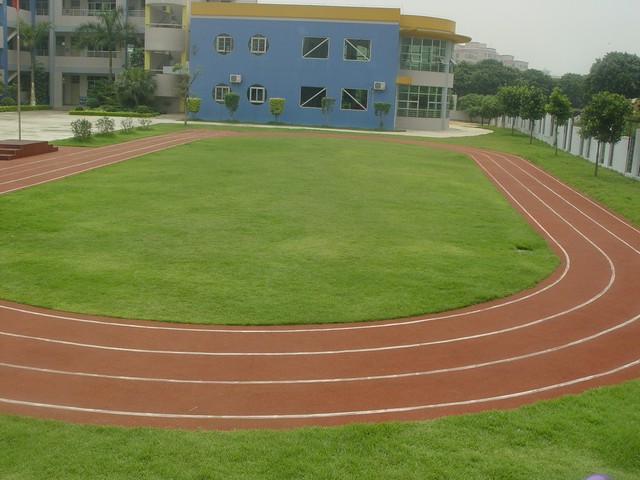 透气型跑道以再生胶粒与单组分胶水混合,由机械摊铺而成。造价低、透气、透水,适用于中小学非竞赛场所运用。